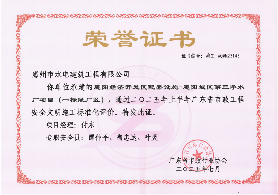 近日,廣東省市政行業(yè)協(xié)會傳來喜訊,由我司承建的惠陽經(jīng)濟(jì)開發(fā)區(qū)配套設(shè)施—惠陽城區(qū)第三凈水廠項目(一標(biāo)段廠區(qū)),順利通過2025年上半年“廣東省市政工程安全文明施工標(biāo)準(zhǔn)化”評價。……